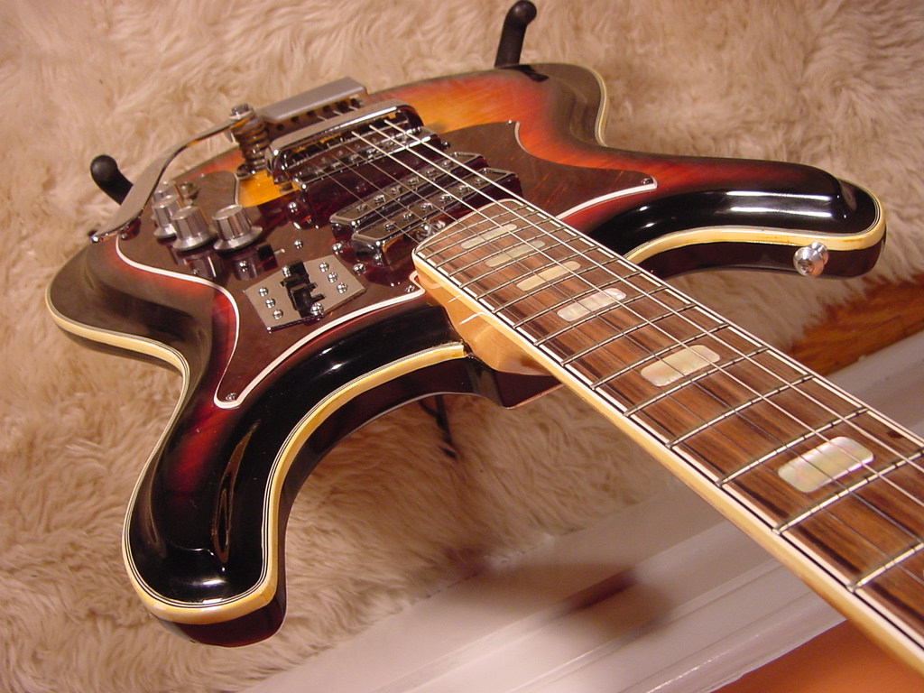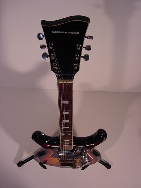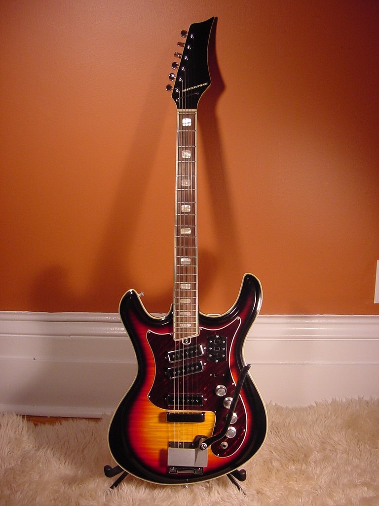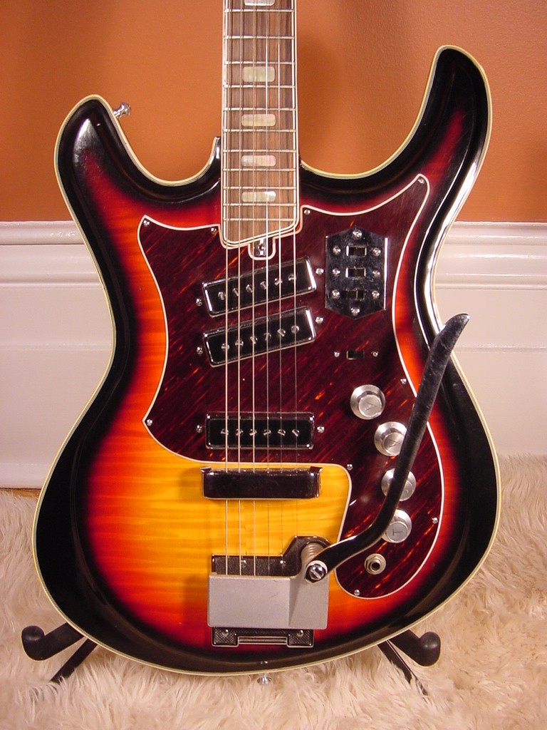 With the popularity of surf bands – especially The Ventures – taking hold in the late 1960’s, Mosrite guitars started gaining traction. Soon there were many knockoffs coming from Japan, these two with the Silvertone brand. It was a simple, solid body design, with the Mosrite body shape and featuring the slanted pickup mount. But this one had three pickups with individual on/off switches, making it 50% better than the Mosrite. Not! Bolt-on neck with zero fret, truss rod access in the heel and a crazy long tremolo arm. All in all a pretty good budget version of the real deal with great tone. This model also came in 2 pickup versions, another version with slider volume and tone knobs, and for some reason different headstock shapes were available. I am not 100%, but I think this was due to different import companies. So for example, Sears in USA had a different headstock than Sears in Canada. You can also find the identical guitar with alternate branding, such as Kawai.