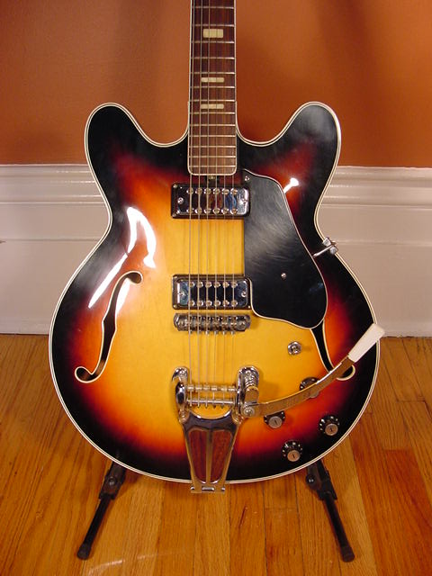 This model was available in 2 pickup configuration, 3-way switch, dual volume and tone controls with a Bigsby style tremolo. Here is a fine example in Sunburst, but it was also available in traditional cherry.