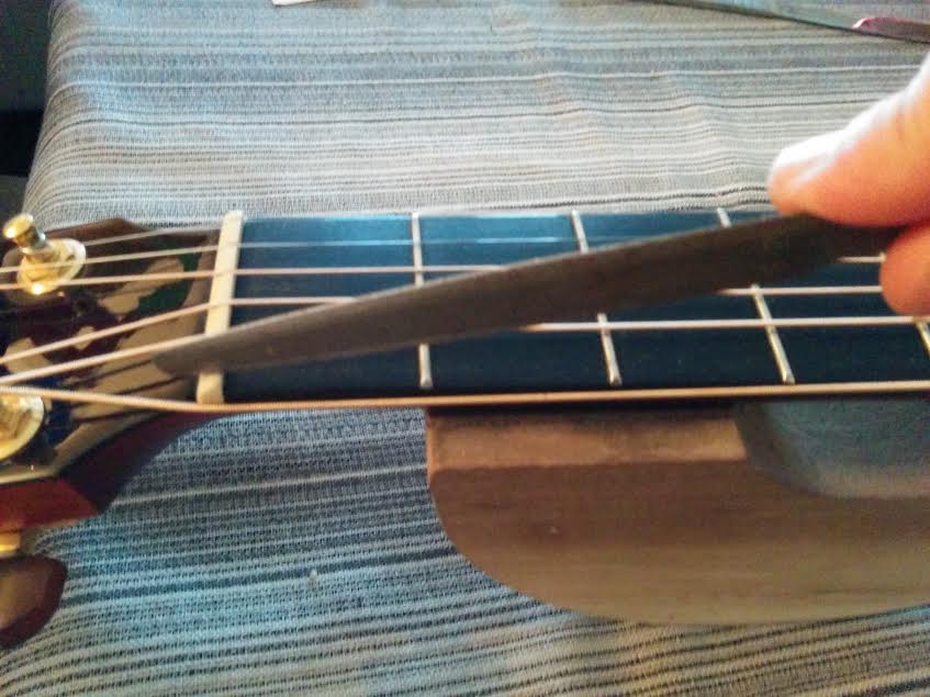 To begin the process, remove the E string from its slot. File gently, forward and backwards once or twice. Put the string back in, and check its height again using the “third fret – first fret” method described above. This will give you an idea of how much distance remains for you to file. Ideally, you will want there to be almost no movement in the string when you push it down to the first fret. Continue the filing process until this distance is achieved, then repeat for each string. *NOTE* – Try not to loosen the string when removing it from the slot. If you must, be sure to tune it to pitch when testing its height.