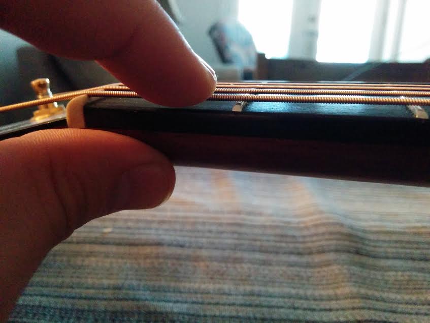 Once your neck is set, you can assess the nut. With your right index finger, push down the low “E” string in the third fret. If the string is resting on the first fret at this point, either the slots are already cut perfectly or they’re too deep. If it isn’t resting on the fret, tap the string with your left index finger. If there is distance, and the string moves up and down, then there is room to file the nut slot down.