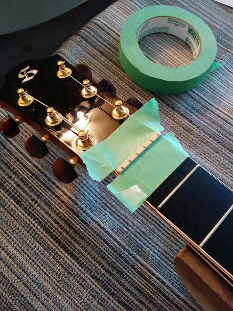 Next, run a piece of masking tape along the finger board right beside the nut, and another on the headstock beside the nut. This will be to protect from glue spillage during the next step. Many guitar nuts are not firmly secured to the neck here, so an alternative would be to just take the nut off altogether for this step.