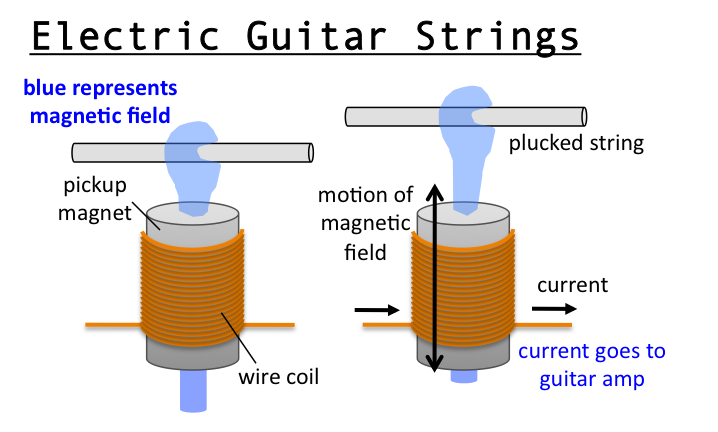 So that’s how a pickup turns a vibrating string into electricity – but how does this electrical signal turn back into the original note once the amp spits it back out? The simple answer is that it already is the “same note”. The pitch of a string is dependent on the frequency of its vibrations, determined by the string’s length, tension, and thickness. When you fret a string, you are essentially shortening that string’s length, therefore altering the way the string is vibrating. The magnetic field vibrates in the same way that the string is, so the same frequencies get reproduced through the amplifier. Neat, huh? A 200 year old technology that is still used to great effect today, although perhaps sometimes overdone!