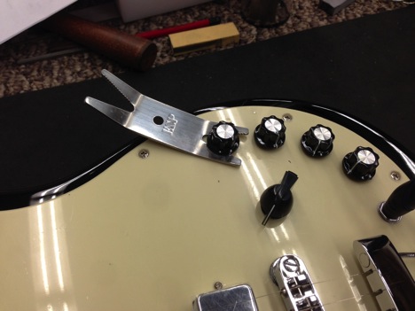 This tool is great for both turning various sized bolts and prying a knob off. Again, start gentle and slowly lift off the knob. Be sure to lay a shop towel or something soft underneath when you use this as it is metal and can potentially scratch your guitar.