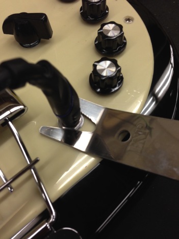 If it’s not so simple to access, such as a jack that leads directly into the body with no plate, use your 1/4″ cable. Plug it in, hold the cable tight, and then proceed to tighten the bolt.