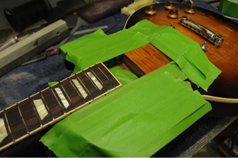 Once the markings are done, you can get ready to start filing! Again, as a precaution and to save from cleaning up metal “dust” afterwards, you can tape off the neck. It’s also a good idea to lower the neck pickup if you feel you may slip and hit it, and taping off the whole top section of the body will prevent fret filings from flying into the pickup cavities or onto the guitar.
