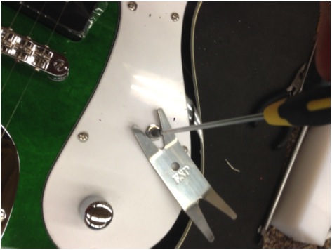 Before opening the guitar up, check that the knobs and the input jack are tight. A loose bolt can signal the reason for the problem – if the bolt is loose and a knob is turned, the whole pot will spin. This can eventually lead to wires being disconnected. In order to properly tighten a bolt, hold the top still with a flat head screwdriver, and then tighten with your pliers like so: