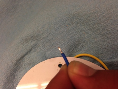 When you’ve found the wire that needs to be re-soldered, you can get your soldering iron ready. When it’s hot, you’ll need to “tin the tip”, which just means to melt some solder on to the tip of the rod, and then wipe it on the wet sponge. The fresh solder on the tip allows for better solder and heat flow. If the wire is still somewhat attached, you can use the iron to melt the solder holding it and detach it completely. Often a wire may need to be prepared to be re-attached, such as this one: