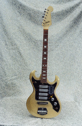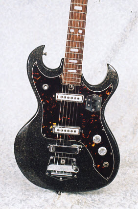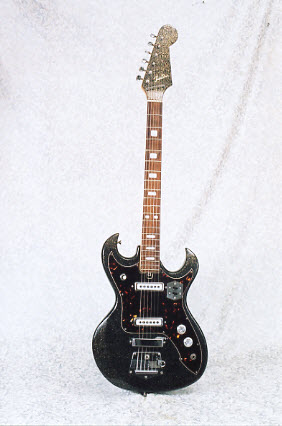 In 1967, following the corporate gobbling frenzy of the times, TeleStar became a part of the Music-Craft Electronic Corporation and moved to 651 Broadway. It was from this era that the TeleStar Professional Solid Body Sparkle Electric 5002 seen here comes. Sort of inspired by a Burns Bison, this is a Kawai product. Like many ‘60s Japanese guitars, a light weight, delicate wiring, and slightly awkward sliding controls tend to cause folks to look down on these guitars, but they really can be set up to play and sound satisfactorily. However, let’s face it, the reason you really want one of this is for the sparkle finish, little silver specks that would make this guitar twinkle in the spotlights!
