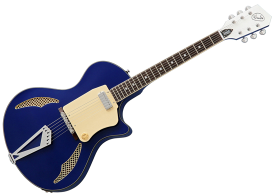In early 1960’s Europe, the Tri-Lam was one of Wandrè’s best-selling models. As all 60’s Wandre models, the original version had an aluminum neck. Our modern version sports a set maple neck, suspended pickguard, pickup and master volume, and a full hollowbody design that includes the unusually stylish grilled f-holes. The original 1960’s models fetch over $3,000. Shipping Now for only $799!