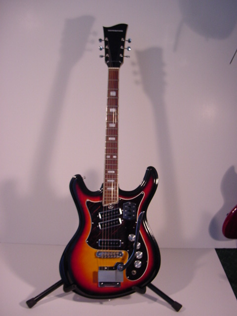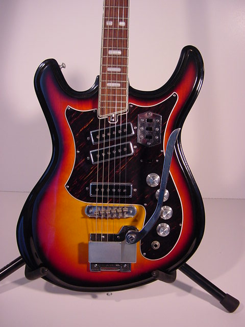 With the popularity of surf bands – especially The Ventures – taking hold in the late 1960’s, Mosrite guitars started gaining traction. Soon there were many knockoffs coming from Japan, these two with the Silvertone brand. It was a simple, solid body design, with the Mosrite body shape and featuring the slanted pickup mount. But this one had three pickups with individual on/off switches, making it 50% better than the Mosrite. Not! Bolt-on neck with zero fret, truss rod access in the heel and a crazy long tremolo arm. All in all a pretty good budget version of the real deal with great tone. This model also came in 2 pickup versions, another version with slider volume and tone knobs, and for some reason different headstock shapes were available. I am not 100%, but I think this was due to different import companies. So for example, Sears in USA had a different headstock than Sears in Canada. You can also find the identical guitar with alternate branding, such as Kawai.