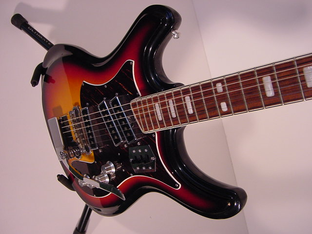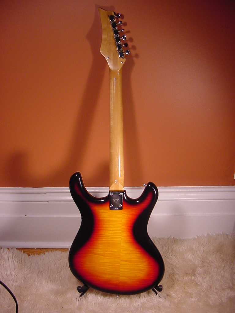 This guitar is the best Mostite copy ever due to the fact that, unlike many others such as Eastwood, it has a 25″ scale length, small fretwires plus a zero fret (necessary to accomplish low action), a thin Basswood body, and a single coil pickup close to the bridge. NOTE: the electronics in this guitar suck- for the best Mosrite like sound, I highly recommed bypassing everything and rewiring the bridge pickup right to the jack. I only use the bridge pickup and speaking of which, I recently replaced the original pickup with an “RH-100” pickup from M3 California for like $130. WHOAH, it now sounds exactly I mean EXACTLY like a Mosrite Mark 1, wow! Only thing with that is if you do that you’ll have to have the pickguard routed out & made a little larger and the wood inside the guitar also routed. I tried doing this myself, what a mess- and that wood smells really bad.