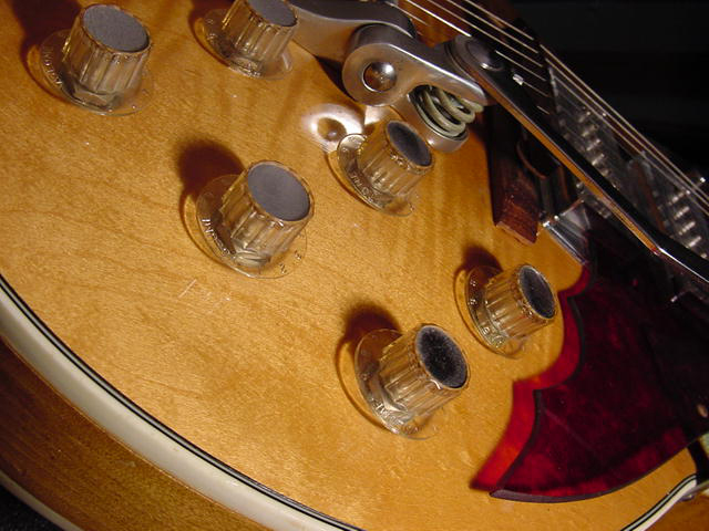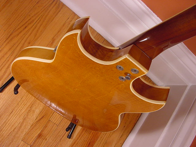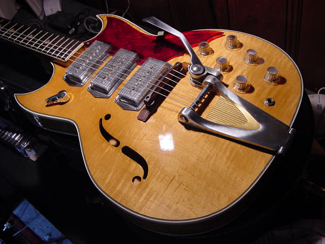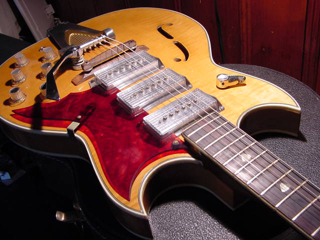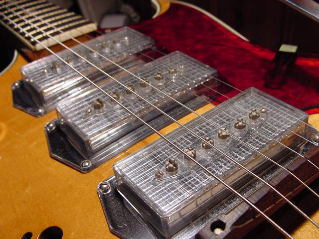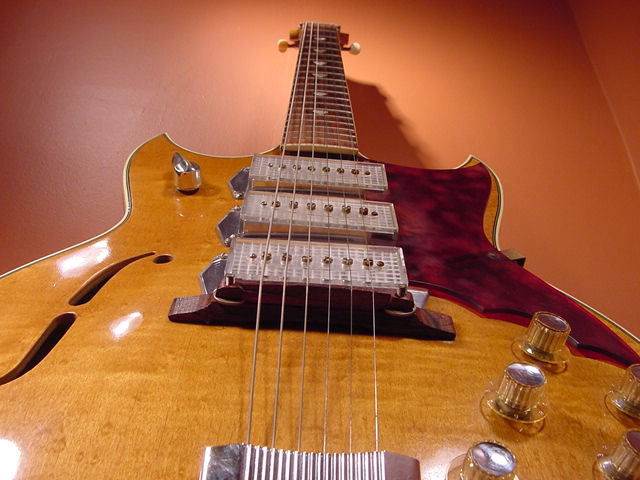 I’m not sure about the floating wooden bridge, but you just have to love the rest… especially the Kleenex Box pickups. The controls, translucent pickguard, the trem unit… to cool!
