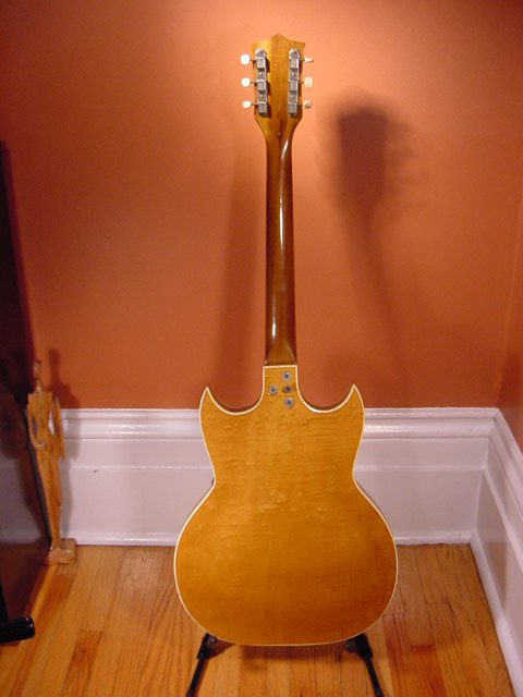 The natural color was unique to the Airline brand. All were outfitted with the “Kleenex Box” pickups. It was available in 2 or 3 pickups models, with or without the Bigsby style tremolo and a wooden, floating bridge. Bolt-on neck with a flamed maple bound body on top and bottom. Each pickup had its own volume and tone controls and there was a flipper switch for pickup selection.