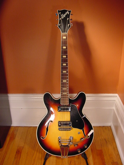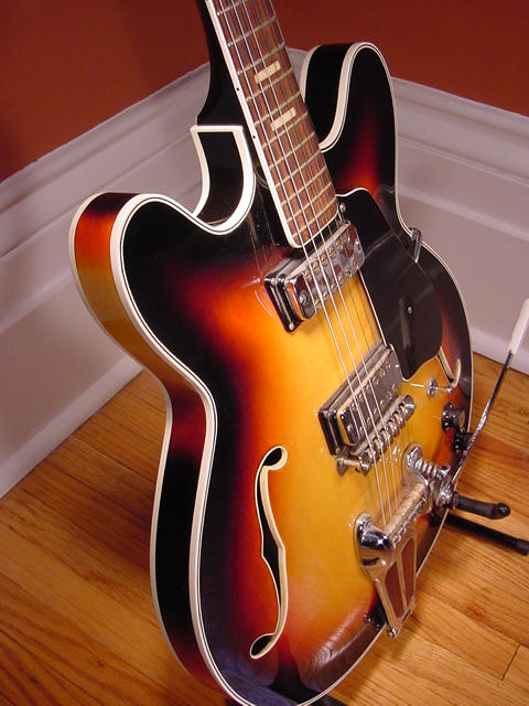 This model was available in 2 pickup configuration, 3-way switch, dual volume and tone controls with a Bigsby style tremolo. Here is a fine example in Sunburst, but it was also available in traditional cherry.