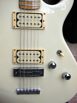 The solid body is of medium weight and of a shape that will be familiar to all electric guitar enthusiasts. There are two ‘humbucking’-type pickups, and a three way toggle selector switch mounted close to the volume control knob. A coil tap enables marked changes to the overall tone and to an extent the volume. The sound range is wide, going from sharp cutting treble to a very warm and bassy neck pick up. The hardware appears to be stainless steel, as there is no evidence of corrosion. The tail piece is fixed and sits out of the way behind a sophisticated bridge with screws for adjustment in front and behind, each string passing over an independent saddle. The cream white colour makes it stunning in appearance and it is a joy to play.