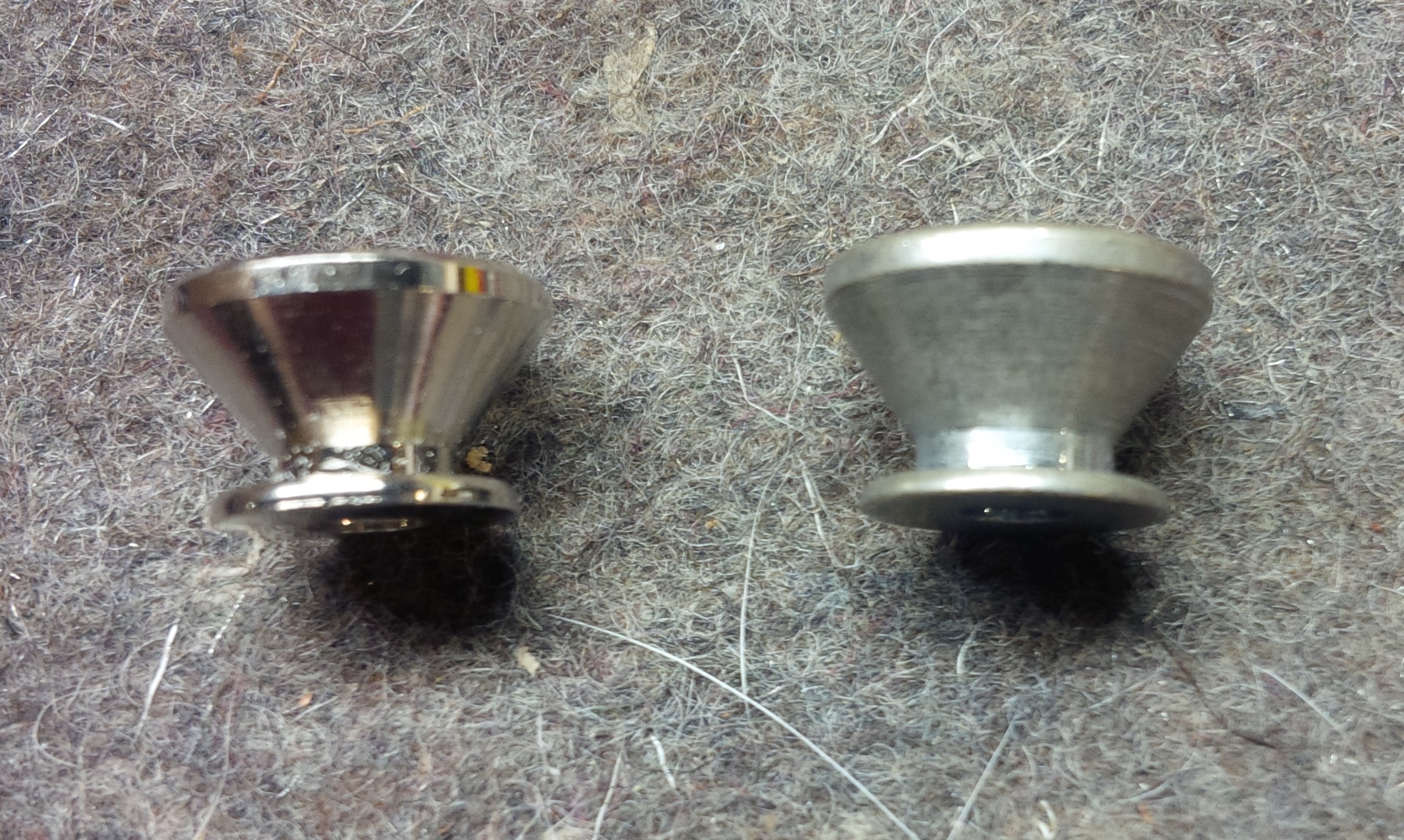 The most common type of strap button, found on many brands including Gibson and Fender. These are easy to obtain including reliced versions like the one on the right.