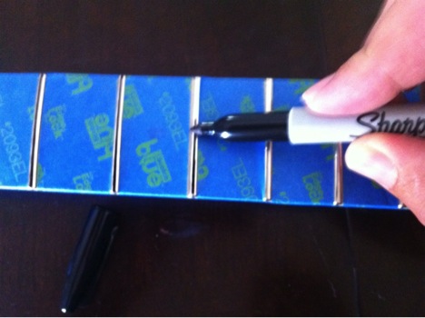 With a straight neck and the strings off, you can begin to map out the bad frets. Using a fret rocker or straight edge, test each fret in the same way I explained in Issue 5. This time, however, you need a way to remember where the problem areas are. With a sharpie, mark along each fret where the rocker… rocked. If you’re nervous about slipping with the marker, you can tape off the entire neck as seen in this picture: