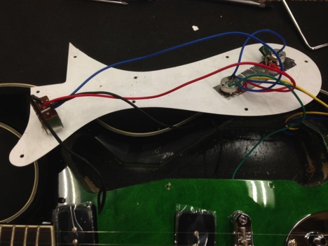 Here, I’ve opened up an Eastwood Sidejack which has the electronics mounted to the pick guard: