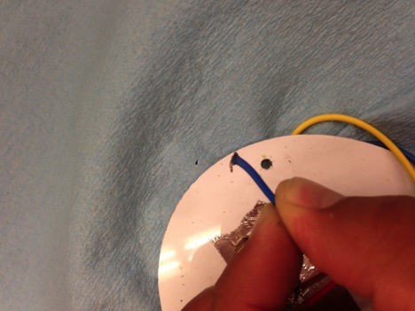 When you’ve found the wire that needs to be re-soldered, you can get your soldering iron ready. When it’s hot, you’ll need to “tin the tip”, which just means to melt some solder on to the tip of the rod, and then wipe it on the wet sponge. The fresh solder on the tip allows for better solder and heat flow. If the wire is still somewhat attached, you can use the iron to melt the solder holding it and detach it completely. Often a wire may need to be prepared to be re-attached, such as this one: