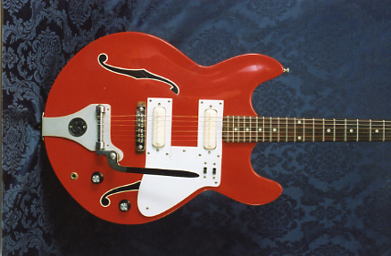 Looking at the Southern California guitarmaker landscape at the time—excluding Fender and Rickenbacker, of course—the most likely source for this guitar is Murph. This looks for all the world like a Murph Gemini. Murph guitars were made in another northern L.A. suburb of San Fernando, CA, by Thomas Patrick Murphy from 1965-67, mainly as a vehicle to help promote the pop music act put together by his children. The best known models were the Squier and a heart-shaped Satellite that Dan Forte (aka Teisco del Rey) loves to feature. The Gemini was a thinline hollowbody with a pair of f-holes. The Murph Satellite had a headstock with a little Woody Woodpecker peak at the tip. Visit www.murphguitars.com for more information on Murph guitars.