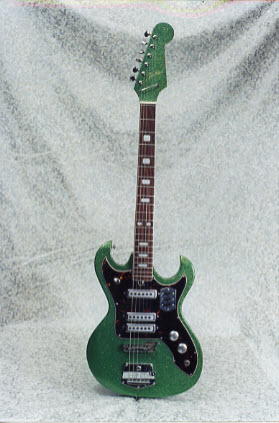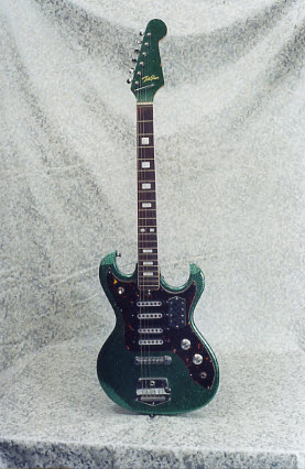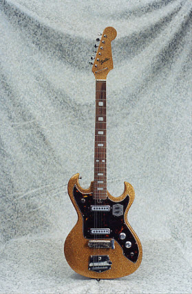 In 1967, following the corporate gobbling frenzy of the times, TeleStar became a part of the Music-Craft Electronic Corporation and moved to 651 Broadway. It was from this era that the TeleStar Professional Solid Body Sparkle Electric 5002 seen here comes. Sort of inspired by a Burns Bison, this is a Kawai product. Like many ‘60s Japanese guitars, a light weight, delicate wiring, and slightly awkward sliding controls tend to cause folks to look down on these guitars, but they really can be set up to play and sound satisfactorily. However, let’s face it, the reason you really want one of this is for the sparkle finish, little silver specks that would make this guitar twinkle in the spotlights!