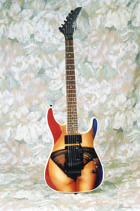 I’m not sure how this graphic was produced, but I’m guessing its some sort of photo-printing process of an original airbrushed image. This is a pretty standard form of Superstrat, with the H/S/H pickup layout. The pickup covers are marked “Vester” and encase serviceable Korean pickups. The controls are interesting. Supporting the master volume and tone are the mini-toggles that control each pickup. The single-coil is on/off. However, the humbuckers are on/off/on, reversing the phase between the two on positions. Pretty clever and pretty complicated, if you ask me.